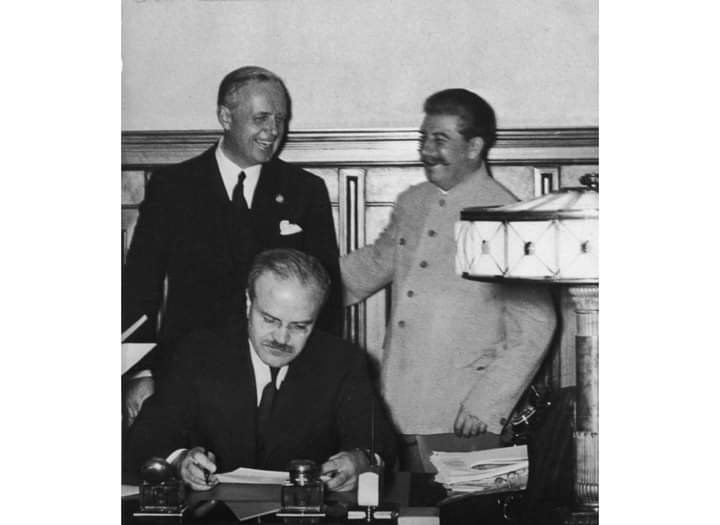 स्थायी: नाजी विदेश मंत्री जोआचिम वॉन रिबेंट्रोप के साथ जोसेफ स्टालिन; बैठे: सोवियत विदेश मंत्री व्याचेस्लाव मोलोतोव-नाजी-सोवियत गैर-आक्रामकता संधि पर हस्ताक्षर करने पर।